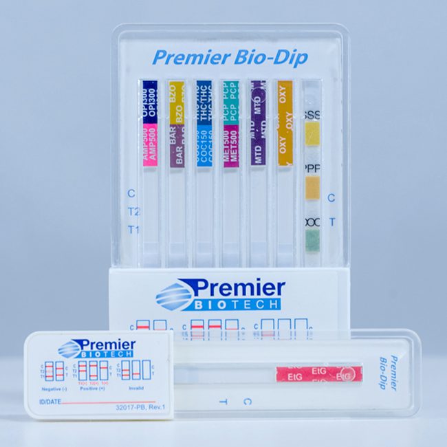 The standard OPIATE panel cross reacts with morphine, codeine, hydrocodone, hydromorphone. To effectively test for the synthetic opioids (prescription pain pills) specific tests strips are required. Oxycodone, fentanyl, tramadol, and buprenorphine require their own specific teststrips. Premier Biotech’s innovative portfolio includes exclusive configurations that tests for many of the prescription opioids and the most relevant drugs of abuse.