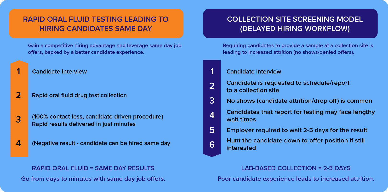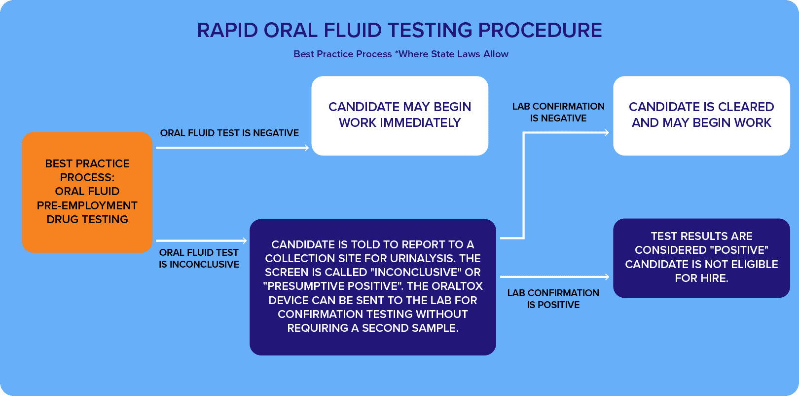 For many years lab-based urine testing was the go-to method for workplace drug testing. While this method maintains an important role in drug testing, employers throughout the country are now leveraging rapid oral fluid testing more than ever before. Technological advancements in recent years have greatly improved the reliability and accuracy of oral fluid testing, more specifically as a rapid result point of collection test (POCT). Adding oral fluid testing to your drug testing program provides many advantages and simplifies the drug testing process for employers, employees, and job applicants.